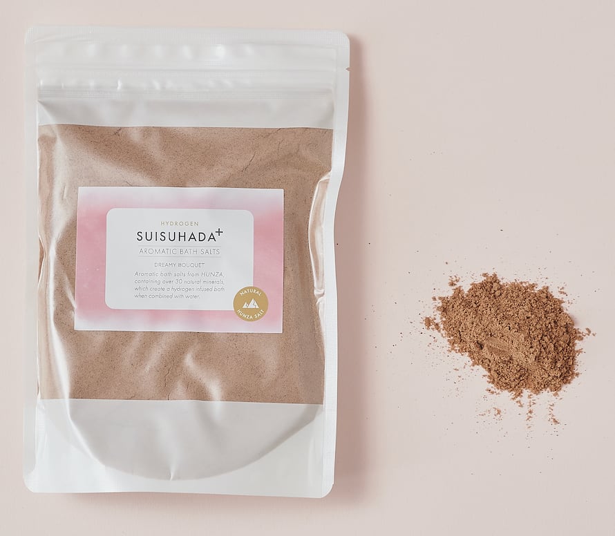 水素を発生させる天然岩塩に贅沢に高級アロマオイルを配合した、天然岩塩バスソルト。